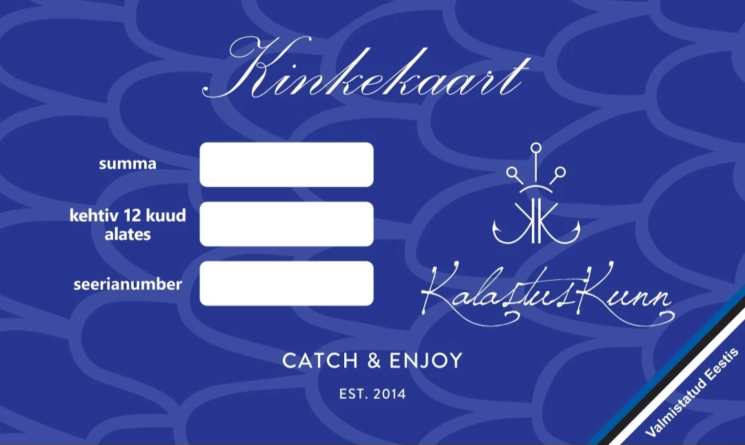 Kinkekaart kalamehele – ideaalne kingitus igale harrastuspüüdjale! Sobib kasutamiseks kogu e-poes: valikus käsitööritvad, dropshot rakendused, talvepüügi varustus, korgipüügikomplektid, muskad ja palju muud.